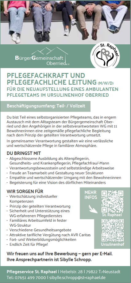 Im Rahmen der selbstverantworteten Wohngemeinschaft im Ursulinenhof in Oberried haben die Angehörigen entschieden, die pflegerische Versorgung neu zu beauftragen.Es soll ein festes, ausschließlich der Wohngemeinschaft zugeordnetes Pflegeteam eingesetzt werden.